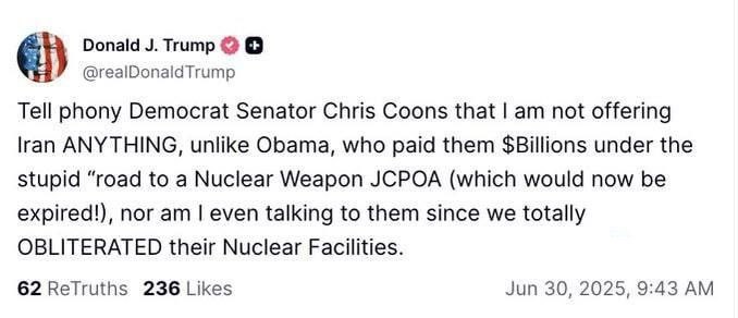 او در پیامی که امروز (دوشنبه) در شبکه اجتماعی خود به نام «تروث سوشال» منتشر کرد، نوشت: «به سناتور دموکرات دروغگو، کریس کونز، بگویید که من هیچ چیز به ایران پیشنهاد نمیدهم، برخلاف اوباما که میلیاردها دلار تحت توافق احمقانه “برجام” به آنها داد (که حالا هم منقضی شده!).»