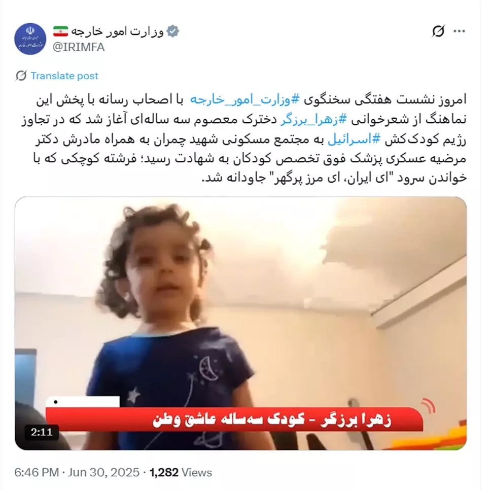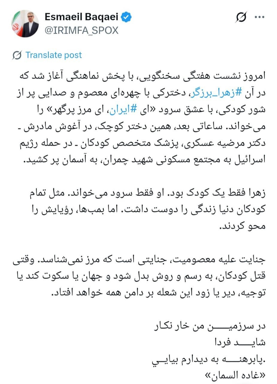 «امروز نشست هفتگی سخنگویی، با پخش نماهنگی آغاز شد که در آن ⁧‫زهرا برزگر‬⁩، دخترکی با چهره‌ای معصوم و صدایی پر از شور کودکی، با عشق سرود «ای ⁧‫ایران‬⁩، ای مرز پرگهر» را می‌خواند. ساعاتی بعد، همین دختر کوچک، در آغوش مادرش ـ دکتر مرضیه عسکری، پزشک متخصص کودکان ـ در حمله رژیم اسرائیل به مجتمع مسکونی شهید چمران، به آسمان پر کشید.